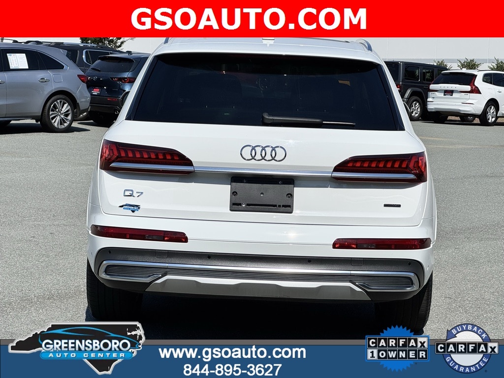 Certified. Carrara White 2022 Audi Q7 45 Premium quattro quattro 8-Speed Automatic with Tiptronic 2.0L 4-Cylinder TFSI New Arrival, TECHNICAL - 2.0L TFSI l4 engine - 8-speed Tiptronic transmission - quattro all-wheel drive system - Energy recuperation system and engine start-stop - 19" 5-arm-star design wheels with all-season run-flat tires COMFORT/TECHNOLOGY - Audi advanced key w/ handsfree tailgate (open/close) - Audi connect CARE (limited time subscription) - Audi connect PLUS (6 mo. trial, acceptance of Terms req'd) - Audi MMI Navigation plus w/ MMI touch response - Audi smartphone interface - Audi sound system - Audi virtual cockpit plus - Aluminum roof rails - Auto-dimming interior mirror w/ compass - Bluetooth w/ audio streaming - Garage door opener (HomeLink) - Heated, auto-dimming, power-folding exterior mirrors with memory - Heated front seats - Integrated Toll Module: Nationwide Toll Collection Technology (subscription req'd) - Leather seating surfaces - LED headlights w/ high beam assist - Panoramic sunroof with electric sunshade - Power adjustable front seats with driver memory/lumbar - Power-folding 3rd row (includes LATCH for all 2nd & 3rd row seats) - SiriusXM w/ 360L (3 mo. trial subscription, acceptance of Terms req'd) - Three-zone automatic climate control - 3-spoke multifunction steering wheel w/ shift paddles - 7 passenger seating SAFETY/CONVENIENCE - Advanced Airbag Protection System with 8 airbags - Anti-lock Braking System (ABS) w/ Brake Assist - Electronic Stabilization Control (ESC), multi-mode - Electronic vehicle immobilization w/ anti-theft alarm & interior motion sensor - Tire Pressure Monitoring System (TPMS) - Front & rear parking sensors w/ rearview camera - Audi pre sense basic (preventative occupant protection) - Audi pre sense front (forward collision warning & avoidance assistance) - Child safety locks in rear doors, power - Lower Anchors and Tethers for CHildren (LATCH) - Lane Departure Warning (LDW) - Audi side assist (blind spot warning) - Rear cross-traffic warning, Carrara White Included Black interior Included Convenience package $1,200.00 Audi phone box w/ wireless charging and signal booster Heated steering wheel Top view camera system Audi Beam - Rings $475.00.