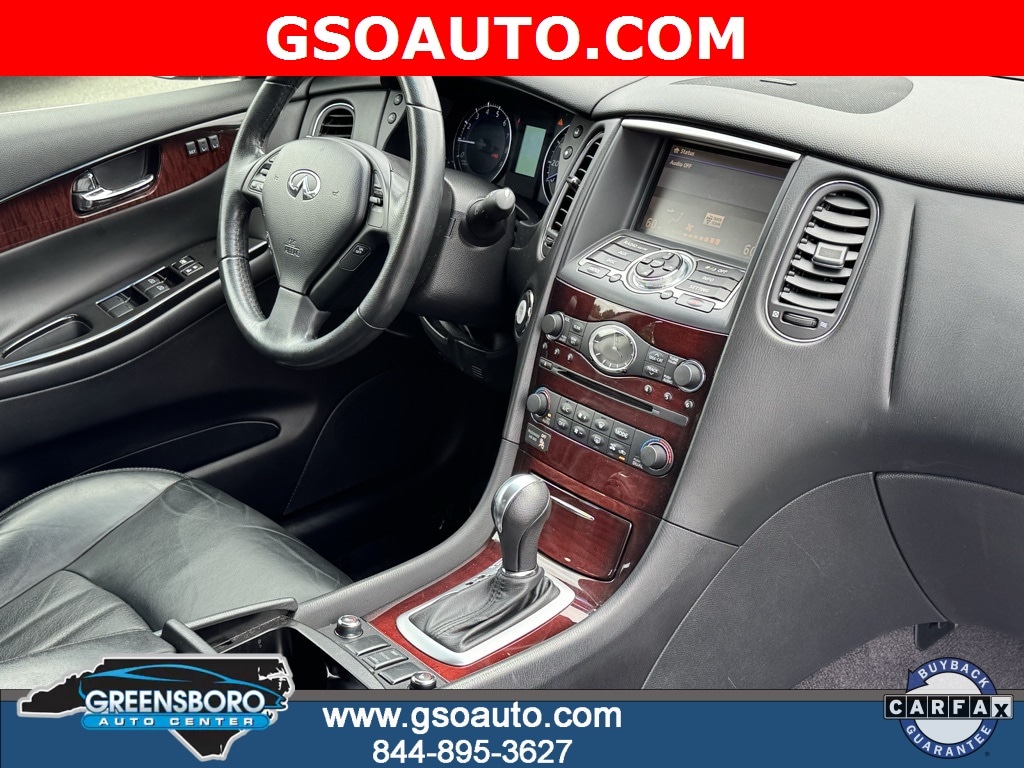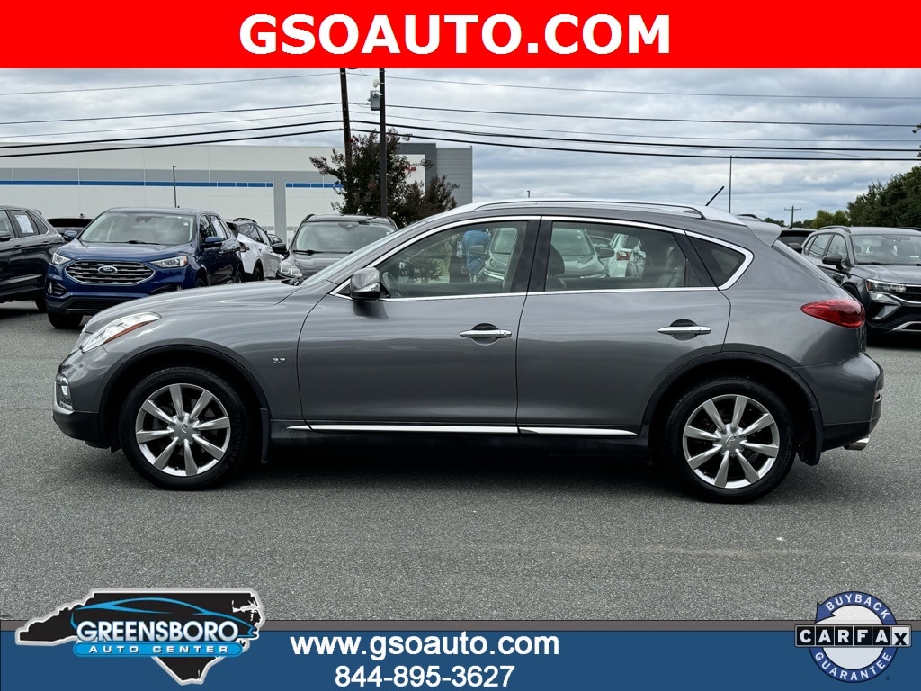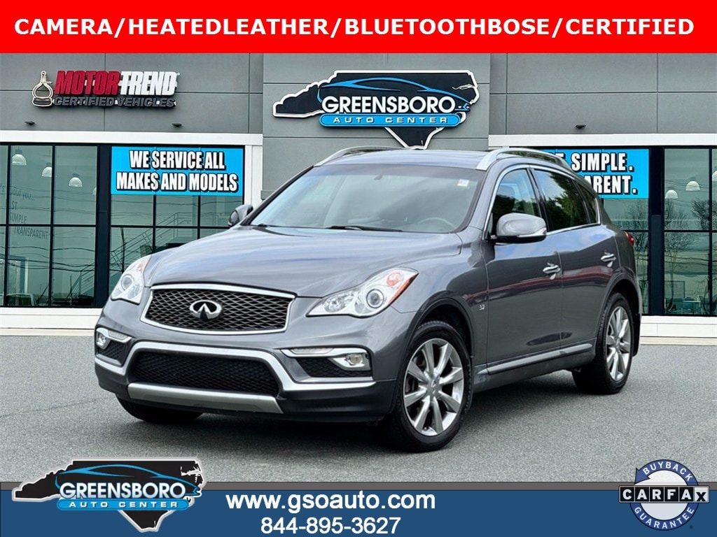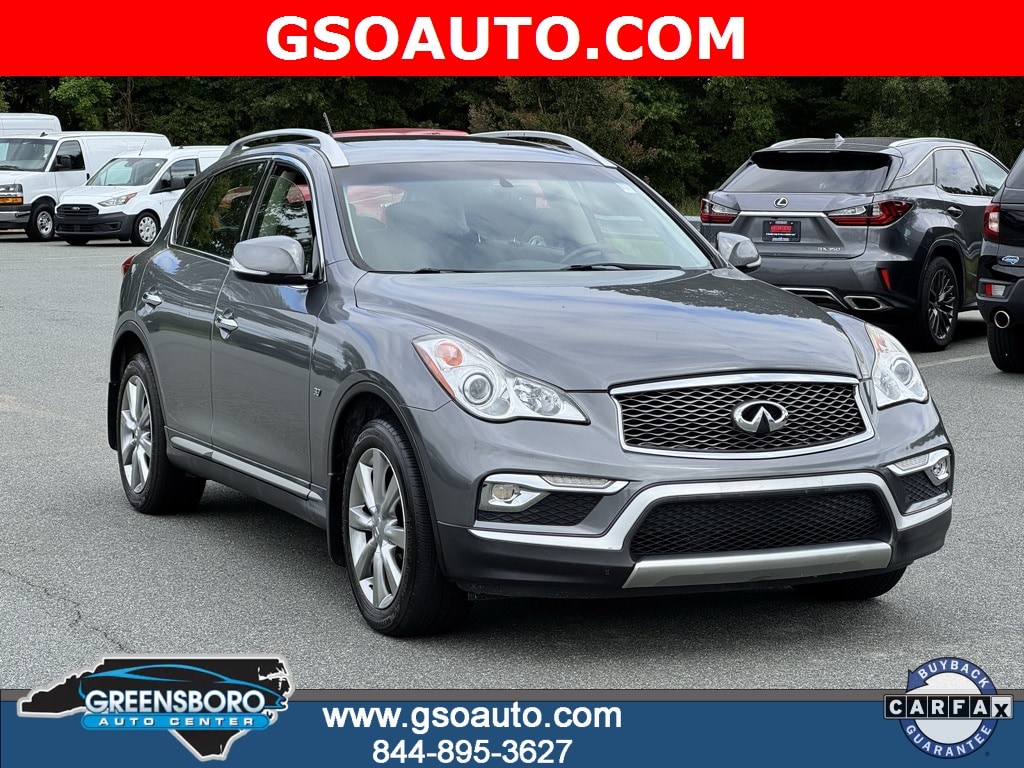 Certified. Graphite Shadow 2016 INFINITI QX50 Base AWD 7-Speed Automatic 3.7L V6 DOHC 24V New Arrival, SAFETY AND SECURITY: INFINITI Advanced Air Bag System Driver and Front Passenger seat-mounted side-impact supplemental air bags Roof-mounted curtain side-impact supplemental air bags for front and rear seat outboard occupant head protection 3-point height adiustable front seat belts 3-point height aojustable o a with pretensioners, and load limite Front-seat Active Head Restra Lower Anchors and Tethers for CHildren (LATCH) Child safety rear door lock Child satety rear door lock 4-wheel Anti-lock Braking System (ABS) Brake Assist Electronic Brake force Distribution Vehicle Dynamic Control (VDC) with Traction Control System (TCS) Tire Pressure Monitoring System (TPMS) Vehicle Security System (VSS) InfinitiVehicle Immobilizer System, 3.-lel vo engin 325 horsepower 267 lb-ft torque INFINITI Intelligent All-Wheel Drive (AWD) with Snow Mode 7-speed automatic -speed automatic transmission transmission with wit Adaptive Shift Control(ASC) and manual shift mode with Downshift Rev Matching 18-inch, 8-spoke aluminum-alloy wheels with 225/55R18 all-season tires Independent front pendent front and multi-link rea suspension Front and rear stabilizer bars LUXURY: Leather Leather-appointed seats Heated 8-way power driver's and 4-way power passenger's front seats Driver's seat adjustable lumbar support Power sliding, tinted glass moonroof Leather-wrapped steering wheel and shift knob Tilt/telescopic steering column Black lacquer interior trim Dual Zone Automatic Temperature Control System with microfi Sequential welcome lighting Power windows and door locks Automatic on/off halogen headlights LED front fog lights LED fropt fog liabts LED daytime running lights INFINITI signature analog clock Vehicle-speed-sensitive variable intermittent front windshield wiper intermitentfront windshield wipers Power adjustable heated outside mirrors Cruise control with steering-wheel mounted switch, Options Included by Manufacturer SPLASH GUARDS (4-piece) REAR BUMPER PROTECTOR CARGO AREA PROTECTOR & FIRST AID KIT ILLUMINATED KICK PLATES++ PREMIUM PACKAGE 175.00 220 00 5.0 gagallons per 100 miles 105.0 440.00 500.00 Bose 11-speaker Premium Sound System with single in dash CD/DVD player and with single in dash C/D player Mro playdach capa Advanced Climate Control System Annual fuel Cost $2,500 Gasoline Vehicle You spend $3,500 more in fuel costs over 5 years compared to the average new vehicle. Fuel Economy & Greenhouse Gas Rating(tailpipe only) Smog Rating (tailpipe only) 1 4 10 Best 5 10 Best This vehicle emits 452 grams CO, per mile. The best emits 0 grams per mile (tailpipe only). Producing and distributing fuel also creat ; learn more at fueleco I results will vary for many reasons, including driving conditions drive and new vehicle gets 25 MPG and costs $9,000 to fu Dual occupant memory system for driver's seat outside mirrors and steenng steering wheel, linked to individua Intelligent R Entry/exit assist for driver's seat and steering wheel Outside mirrors with reverse tilt-down HomelinkUniversal Transceive Maple interior accents++ to-dimming inside mirror with to-dimming inside mirror with Power tilt/telescopic steering column Aluminum Roof Rails.