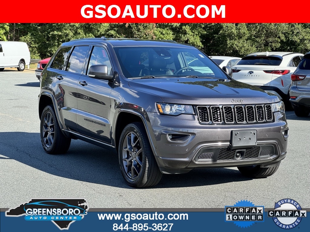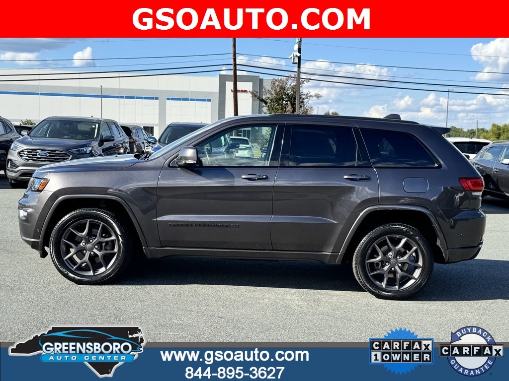 Granite Crystal Metallic Clearcoat 2021 Jeep Grand Cherokee 80th Anniversary Edition 4WD 8-Speed Automatic 3.6L V6 24V VVT ONE OWNER **, CLEAN CARFAX / NO ACCIDENTS REPORTED **, FULLY DETAILED **, FRESH OIL CHANGE **, SAFETY INSPECTED **, New Arrival, Advanced Multistage Front Air Bags Supplemental SideCurtain Front and Rear Air Bags Supplemental Front SeatMounted Side Air Bags Driver Inflatable KneeBolster Air Bag QuadraTrac II 4WD System SelecTerrain System ParkView Rear BackUp Camera ParkSense Rear ParkAssist with Stop BlindSpot and CrossPath Detection Sport Mode Keyless Enter 'n Go RemoteStart System Sentry Key Theft Deterrent System ReadyAlert Braking Speed Control Power Liftgate Electronic Stability Control HillStart Assist TrailerSway Damping INTERIOR FEATURES Uconnect 4C NAV with 8.4Inch Display SiriusXM with 6Month Radio Sub Call 8006432112 SiriusXM Guardian Connected Services w/1Yr Trial 5Year SiriusXM Traffic Service 5Year SiriusXM Travel Link Service SiriusXM Traffic Plus with 5Year Subscription Apple CarPlay Google Android Auto Integrated Voice Command with Bluetooth Media Hub with 2 USB and Auxiliary Port 4G LTE WiFi Hot Spot Heated Front Seats 8Way Power Driver Memory and 8Way Passenger Seats LeatherWrapped Steering Wheel Heated Steering Wheel A/C with DualZone Auto Temperature Control DeepTint Sunscreen Glass AutomaticDimming RearView Mirror Temperature and Compass Gauge EXTERIOR FEATURES 18Inch x 8.0Inch TechGray Diamond Cut Wheels Power Sunroof LowBeam Daytime Running Headlamps Halogen Quad Headlamps LED Tail Lamps, Advanced Multistage Front Air Bags Supplemental SideCurtain Front and Rear Air Bags Supplemental Front SeatMounted Side Air Bags Driver Inflatable KneeBolster Air Bag QuadraTrac II 4WD System SelecTerrain System ParkView Rear BackUp Camera ParkSense Rear ParkAssist with Stop BlindSpot and CrossPath Detection Sport Mode Keyless Enter 'n Go RemoteStart System Sentry Key Theft Deterrent System ReadyAlert Braking Speed Control Power Liftgate Electronic Stability Control HillStart Assist TrailerSway Damping INTERIOR FEATURES Uconnect 4C NAV with 8.4Inch Display SiriusXM with 6Month Radio Sub Call 8006432112 SiriusXM Guardian Connected Services w/1Yr Trial 5Year SiriusXM Traffic Service 5Year SiriusXM Travel Link Service SiriusXM Traffic Plus with 5Year Subscription Apple CarPlay Google Android Auto Integrated Voice Command with Bluetooth Media Hub with 2 USB and Auxiliary Port 4G LTE WiFi Hot Spot Heated Front Seats 8Way Power Driver Memory and 8Way Passenger Seats LeatherWrapped Steering Wheel Heated Steering Wheel A/C with DualZone Auto Temperature Control DeepTint Sunscreen Glass AutomaticDimming RearView Mirror Temperature and Compass Gauge EXTERIOR FEATURES 18Inch x 8.0Inch TechGray Diamond Cut Wheels Power Sunroof LowBeam Daytime Running Headlamps Halogen Quad Headlamps LED Tail Lamps, Premium Fog Lamps PowerHeated Memory MultiFunction Mirrors OPTIONAL EQUIPMENT (May Replace Standard Equipment) Granite Crystal Metallic ClearCoat Exterior Paint $295 Customer Preferred Package 2GK $2,390 20Inch x 8.0Inch Granite Crystal Alum Wheels Light Tungsten Interior Accent Stitching 265/50R20 Performance AllSeason Tires Piano Black / Anodized Gunmetal Interior Accents Black Roof Molding Granite Crystal Exterior Accents Granite Crystal E